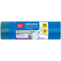 Мешки для мусора 60л OfficeClean ПСД, 60*70см, 30мкм, 15шт., особо прочные, синие, в рулоне, с завязками