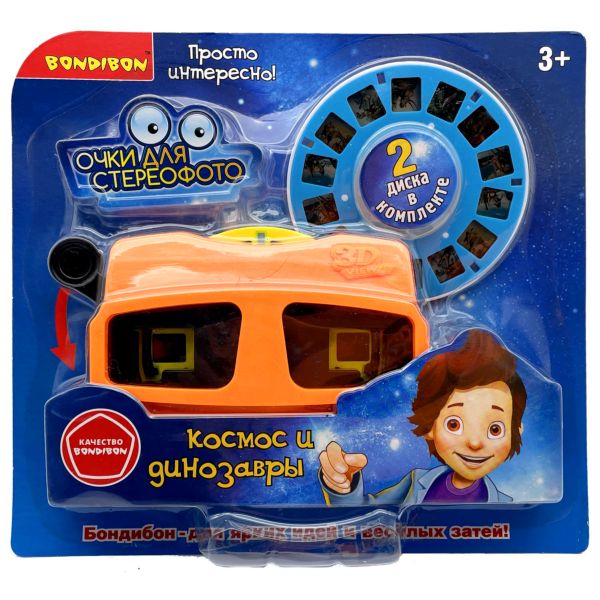 Очки-стереоскоп для просмотра 3D фотографий "КОСМОС И ДИНОЗАВРЫ" от Bondibon – это очаровательная игрушка в стиле ретро, позволяющая рассматривать объемные изображения. Хотите увидеть 3D динозавров или совершить впечатляющее путешествие в космос? Тогда вам нужны cтереоочки от Bondibon! Для просмотра объемных картинок необходимо поместить в портативный проектор диск с цветными слайдами и надеть очки на голову. Яркость изображения регулируется уровнем окружающего освещения. Батарейки не потребуются. Для продолжения просмотра просто поворачивайте диск, не извлекая его из проектора. Компактные размеры позволяют брать детский стереоскоп куда угодно. В комплект входят 3D очки оранжевого цвета и два диска с 14 фотографиями. Все элементы выполнены из прочных и безопасных материалов. Диапроектор рассчитан на пользователей от 3 лет. Очки для просмотра стереофотографий ТМ Bondibon станут отличным дополнением к подаркам на новый год, день рождения, для мальчиков и девочек.