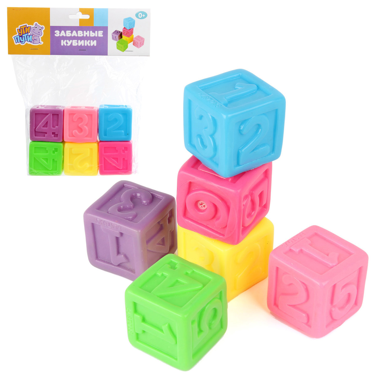 Прекрасный подарок для малыша - развивающие кубики. В комплект входят 6 разноцветных кубиков. На гранях кубиков есть цифры, кубики мягкие, если нажать на центр каждого из них, раздастся забавный пищащий звук. Можно построить башенку из кубиков или расположить их по убыванию и возрастанию цифр - придумывайте забавные игры вместе с ребенком. Игрушка отлично развивает слуховое и зрительное восприятие, мелкую моторику рук и координацию движений, логическое мышление, внимание, помогает научиться считать, знакомит с цветами и формами. Игрушка предназначена для детей до 3 лет. Игрушка изготовлена из высококачественного и безопасного полимерного материала, упакована в пакет с картонным хедером с отверстием. Размеры одного кубика: 5*5*5 см. Размеры игрушки в упаковке: 21,5*5*24 см.