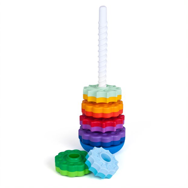 Общая информация об изделии: Развивающая пирамидка, состоящая из 6 двойных колец разного цвета, которые при кручении по стирали увлекают радужными переходами. Материал, из которого изготовлена продукция по данным производителя: Полипропилен, суперконцентрат (краситель) Материал, из которого изготовлена индивидуальная упаковка изделия: Блистерная упаковка, вкладыш (бумага) Комплектность изделия с указанием количества: основа - 1 шт., спираль - 1 шт., кольцо - 6 шт.