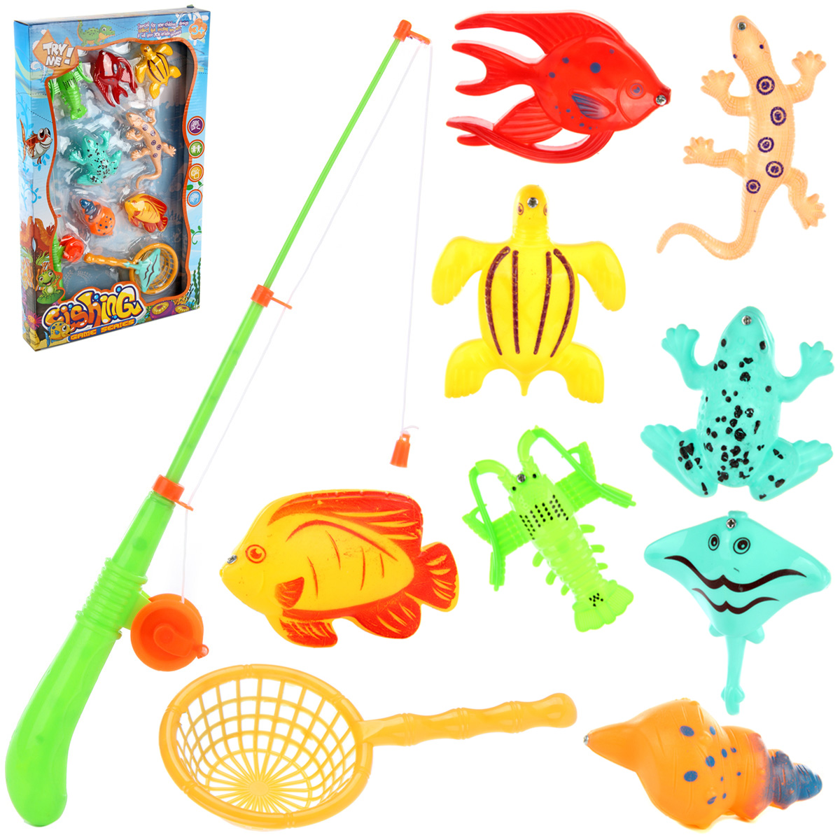 Время веселой и увлекательной рыбалки. У кого окажется больший улов, тот и победил. В комплект входят удочка, фигурки морских обитателей и сачок. Поплавок удочки намагничен, на носиках морских обитателей есть металлические элементы, за счет этого их можно ловить с помощью удочки. Катушка удочки мотает, веревочка-леска разматывается. Игрушка оформлена в красивом и ярком дизайне, который обязательно понравится каждому ребенку. Благодаря такому набору ребенок будет с удовольствием развивать мелкую и крупную моторику, координацию движений, воображение, зрительное восприятие. Игрушка изготовлена из качественного и безопасного полимерного материала, есть элементы металла и магнит. Размеры удочки без учета лески-веревочки: 6*4*42 см. Размеры сачка: 17*8,5*3,5 см. Размеры черепашки: 8*7*2 см. Размеры ящерки: 12*8*2 см. Размеры коробки: 46*5*28 см.