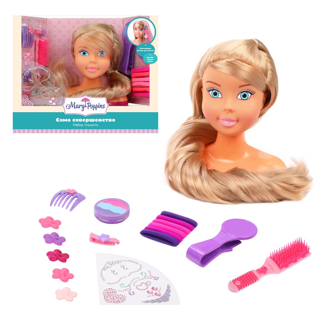 Каждая,пусть даже самая маленькая принцесса стремится к своему собственному, неповторимому образу с самого детства! С помощью игрового набора стилиста от TM Mary Poppins девочка овладеет искусством создавать красивые причёски, которые в дальнейшем сможет слёгкостью делать себе. Волосы манекена сделаны с эффектом ламинирования, они не будут запутываться во время расчёсывания. Их можно заплетать в косички и делать из них хвостики, их можно даже разукрашивать цветными мелками! В комплект входят: манекен, расчёска, 5 заколок для волос, 6 резинок для волос, мелок и держатель мелка, а также многоразовые стразы для украшения лица куклы с вариантами дизайна на обратной стороне упаковки. На упаковке набора также имеется QR -код,с помощью которого можно посмотреть мастер-класс по созданию стильного образа. Длина волос манекена составляет 30 см. Изготовлено из пластмассы с элементами текстильных материалов. Рекомендованный возраст: 3 года +