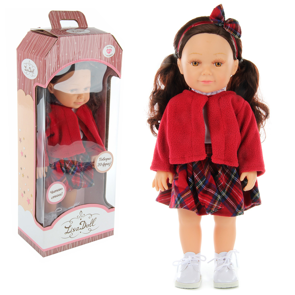 Эта милая и очаровательная куколка покорит сердце любой девочки! Куколка одета в модную одежду, созданную по европейским дизайнам, которая очень ее украшает и создает нежный образ! Куколка умеет говорить 20 фраз и читать забавные стихи, достаточно нажать на центр корпуса тела. У игрушки длинные красивые волосы, которые можно заплетать в роскошные косички и делать разнообразные прически! Ручки, ножки и голова куклы двигаются, все части тела мягкие на ощупь, глазки не закрываются. Бровки нарисованы, есть реснички. Голова прошита волосами полностью. У коробки есть удобная ручка, которая позволяет комфортно переносить игрушку. Забота о такой куколке научит ребенка ответственности, улучшит коммуникативные и социальные навыки, позволит придумать множество интересных сюжетно-ролевых игр, развивая фантазию! Эта куколка - великолепный подарок для девочки, с которым она проведет немало веселых и занимательных часов игры! Игрушка работает от 3 батареек LR44, входят в комплект. Изготовлена из безопасного и высококачественного винила, аксессуары сшиты из ткани. Размеры куколки: 17*9,5*40 см. Размеры коробки: 17,5*11*44,5 см. Фразы, которые умеет говорить кукла: Привет, как тебя зовут? сколько тебе лет? Как приятно познакомиться с тобой! Давай дружить? Нам так весело играть вместе! В какие игры ты любишь играть? А я очень люблю игру в прятки, еще я люблю рассказывать веселые стишки. А ты любишь животных? Мне с тобой так весело! Обними меня! Я тебя люблю! Ой мне так хочется кушать! Покорми меня! После обеда я очень люблю гулять! А ты любишь гулять? Стих: розовые ногти, красная помада, синяя красивая сумочка в руке, я надела платье лучше нет наряда, в садик я готова, мама ну ты где.