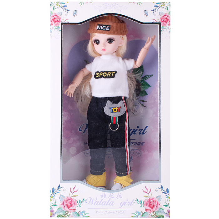Кукла 32см в брючном костюме, в шапочке, в кедах. Длинные волосы. Глаза 3D. Руки и ноги на шарнирах. Упаковка - картонная коробка 20*35,5*7см.