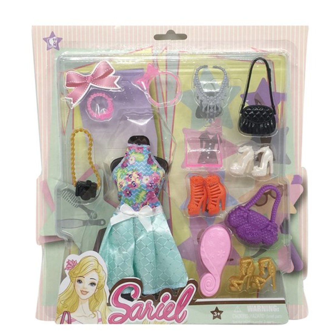 Игровой набор предназначен для создания любимым куколкам модного образа. Он подходитдля кукол высотой 27-30 см. В комплекте есть очаровательное платье, украшенное атласной лентой, пара туфелек, две пары босоножек, расчёска, две сумочки, фотоаппарат на цепочке, очки, ободок, украшение на шею и браслет. Создавая куклам стильные образы, девочка будет развивать чувство вкуса, фантазию и воображение. Изготовлено из текстильных материалов и пластмассы. Рекомендованный возраст: 3 года +