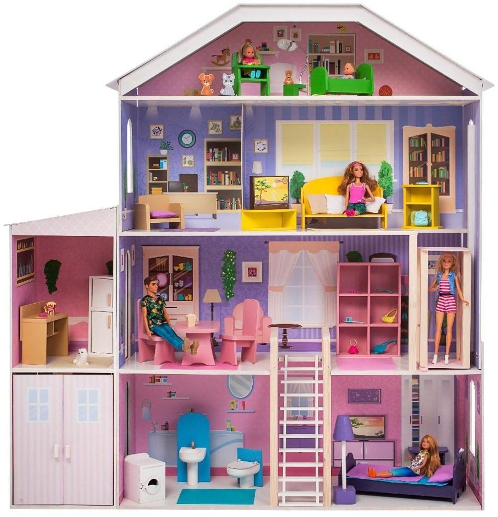 Четырехэтажныйкукольный домик с интерактивом «Фантазия» частично открытый: задняя стенкаглухая, лицевые фасады не предусмотрены. Он разработан специально для куколвысотой до 30 см (прекрасно подходит для Barbie, Winx, Moxie, Bratz, Sonya Roseи т.д.). В комплекте прилагается 19 предметов мебели. ВНИМАНИЕ: Куклы, кукольная одежда, питомцы итранспорт, а также текстиль приобретаются отдельно! Размерыдомика «Фантазия» в собранном виде (ДхШхВ) составляет 130х35х135 см. Весигрушки: 23 кг. Игрушка выполненаиз дерева на 100%, в каркасе и мебели нет ни одного пластикового элемента. Рекомендованный возраст: 3 года +