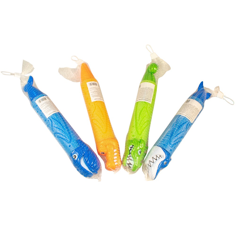 Водное помповое оружие. В ассортименте 4 вида: акула, крокодил, дракон, кашалот. Размер игрушки составляет 34*5*5 см. Голова (наконечник) и хвост (ручка) игрушки выполнены из пластика, корпус – из ПВХ. Оружие погружается в емкость с водою, и посредством оттягивания ручки на себя вода набирается в резервуар. Для осуществления выстрела необходимо толкать ручку оружия в направлении от себя. Поставка осуществляется в дисплее по 24 шт.