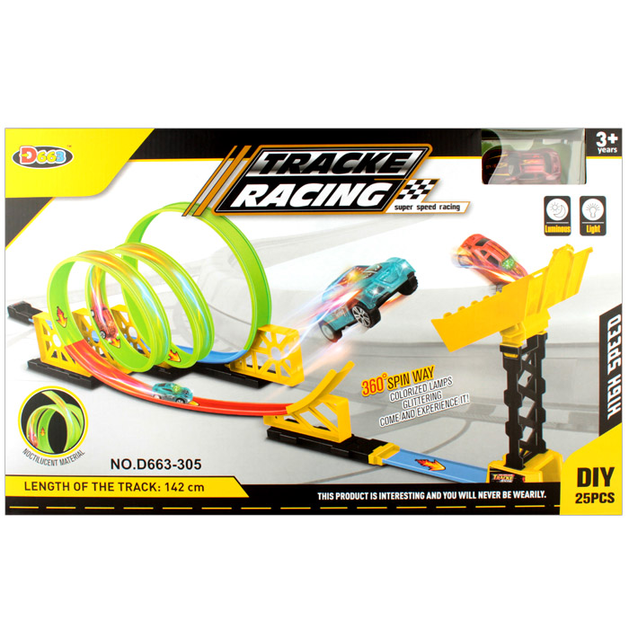 Автотрек 25 предметов , с протяженностью трассы 142см. В комплекте одна машинка, которая при оттягивании назад едет вперед и светится мигалка. Упаковка - картонная коробка 53*33*7см. Работает от батареек типа AG3 (1 шт) - в комплект не входит.