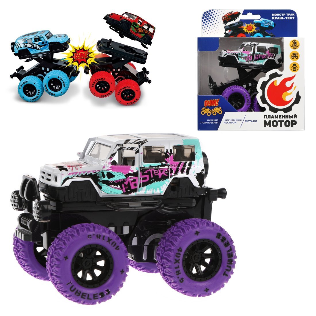 Игрушечная машинка «Монстр трак Краш-тест» обладает уникальными способностями! Она может подпрыгивать на стойках, а во время прыжка у неё «отлетает» кабина. В игрушке предусмотрен инерционный механизм движения, который позволяет ей ездить самостоятельно, а также функция вращения на задних колёсах на 360 градусов. Двери салона открываются вручную. Машинка обладает светозвуковыми эффектами (звуковые активируются при столкновении авто с препятствиями). Игрушка изготовлена из металла с элементами пластмассы. Рекомендованный возраст: 3 года +