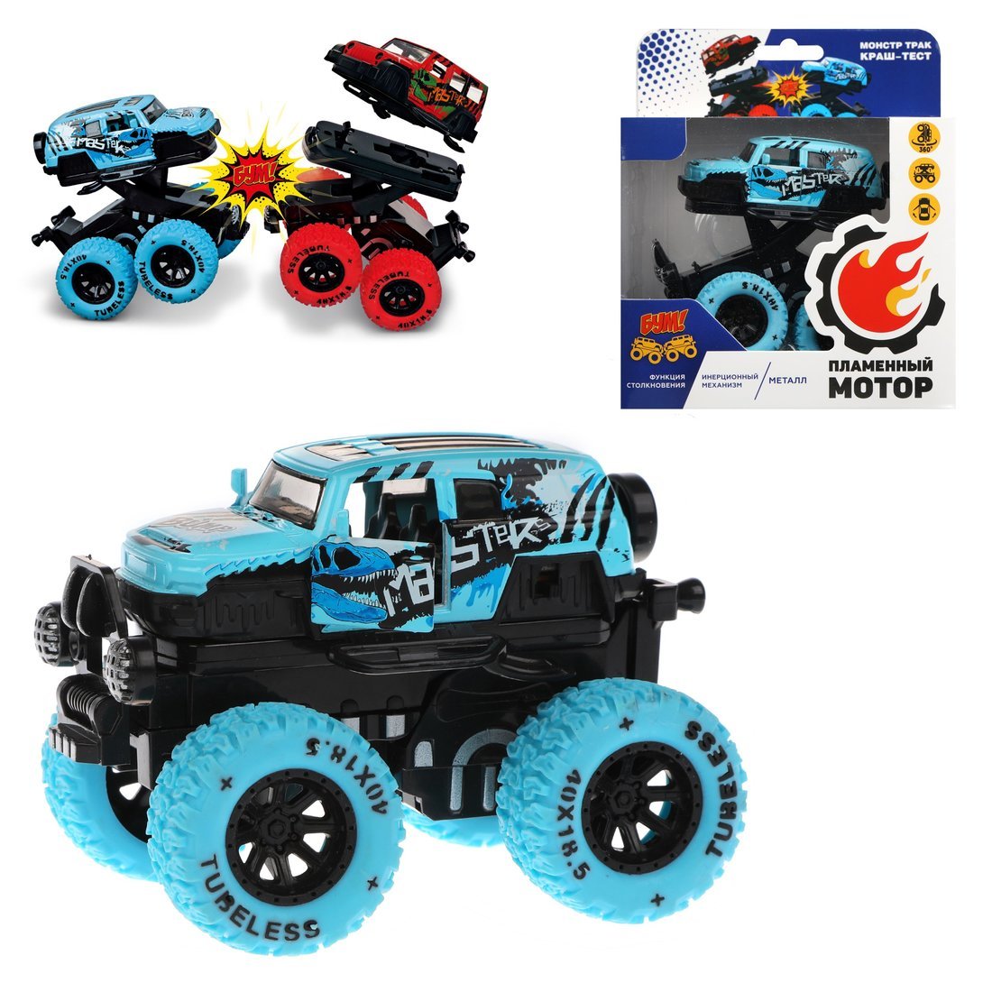 Игрушечная машинка «Монстр трак Краш-тест» обладает уникальными способностями! Она может подпрыгивать на стойках, а во время прыжка у неё «отлетает» кабина. В игрушке предусмотрен инерционный механизм движения, который позволяет ей ездить самостоятельно, а также функция вращения на задних колёсах на 360 градусов. Двери салона открываются вручную. Машинка обладает светозвуковыми эффектами (звуковые активируются при столкновении авто с препятствиями). Игрушка изготовлена из металла с элементами пластмассы. Рекомендованный возраст: 3 года +