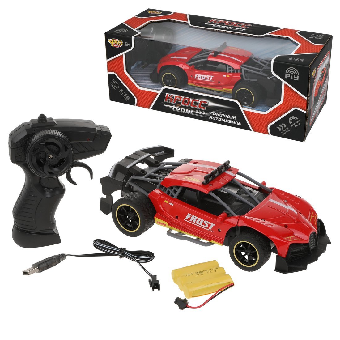 Скоростная машина на радиоуправлении выполнена в масштабе 1:16. Игрушка осуществляет движение во все стороны. Развивает скорость до 10 км/час. Управление производится нажатием кнопки-спускового крючка и прокручиванием бокового колёсика. В конструкции корпуса имеются металлические детали. Дуги и спойлер выполнены из мягкого противоударного пластика. Не полые шины изготовлены из резины. Машина работает от аккумулятора Ni-Cd на 3,6 V (входит в комплект), зарядка производится с помощью USB-кабеля (входит в комплект). Пульт работает от 2-х батареек типа АА на 1,5 V (не входят в комплект). Размер машины (ДхШхВ): 24х12х7 см. Рекомендованный возраст: 6 лет +