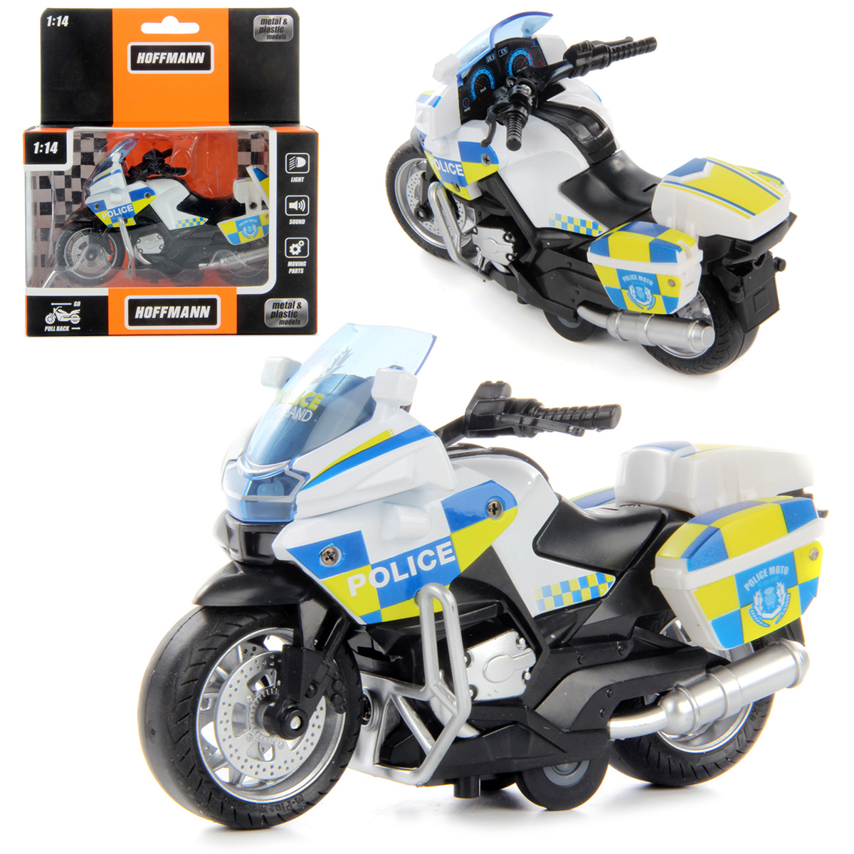 Коллекционные мотоциклы Hoffmann - это высокий уровень проработки игрушки и любовь к деталям. Мотоцикл оснащен инерционным механизмом, прорезиненными колесами, издает звуки заводящегося двигателя, едущего транспорта, полицейской сирены (есть разные звуковые сигналы сирены), катается вперед-назад. Фара подсвечивается. Руль с передним колесом поворачивают. Боковые багажники открываются, можно положить мелкие предметы. Благодаря наличию дополнительных опорных колес мотоцикл сохраняет устойчивое положение. Игрушка изготовлена из износостойких материалов, отличается маневренностью и реалистичным дизайном, масштаб 1:14 позволяет хорошо рассмотреть все детали. С этим мотоциклом ребенок будет с удовольствием играть в сюжетно-ролевые игры, развивая воображение, тренировать координацию движений и мелкую моторику рук. Соберите всю коллекцию мотоциклов Hoffmann, с которой малыш проведет множество веселых и увлекательных часов! Игрушка работает от 3 батареек LR41, входят в комплект. Игрушка изготовлена из металла, есть элементы полимерных материалов. Масштаб 1:14. Размеры игрушки: 13*7*8 см. Размеры коробки: 15*8*17 см.