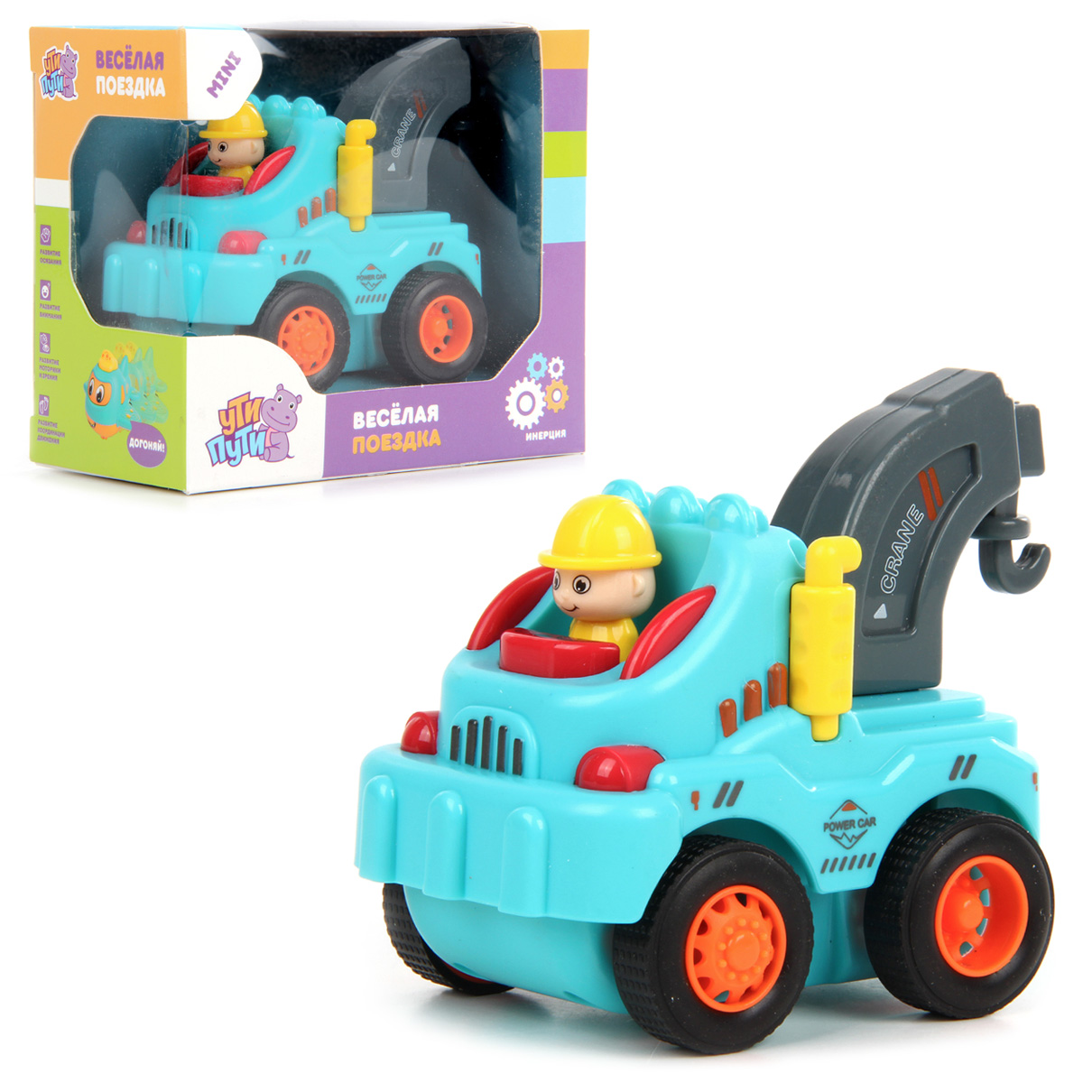 Замечательная игрушка для малыша - компактная и симпатичная машинка, оформленная в ярком дизайне. Она оснащена инерционным механизмом, прорезиненными колесами, ездит вперед-назад. В кабине сидит маленький и очень милый человечек. Деталь с краном у машинки опускается и поднимается. Игрушка отлично развивает воображение, мелкую моторику ручек, концентрацию внимания, координацию движений и зрительное восприятие. Обязательно познакомьте кроху с этой миниатюрной очаровашкой. Игрушка предназначена для детей до 3 лет. Игрушка изготовлена из безопасного и высококачественного полимерного материала. Размеры игрушки: 10*6*7,5 см. Размеры коробки: 11*6*9,5 см.