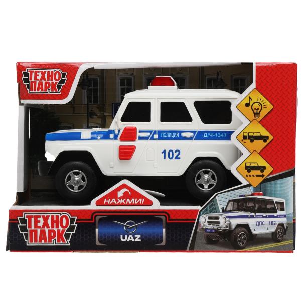 Машина пластик свет-звук UAZ HUNTER ПОЛИЦИЯ 15см, 2 кноп, инер, бел, Технопарк