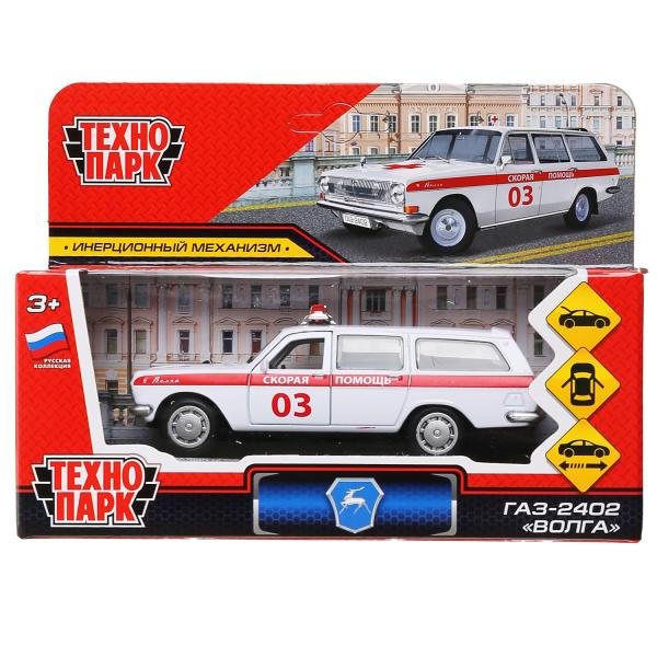 Машина металл ГАЗ-2402 "ВОЛГА" СКОРАЯ 12 см, двери, багаж, белая, в кор. Технопарк