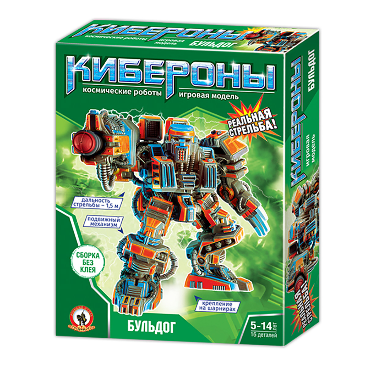 КИБЕРОНЫ – это серия сборных моделей боевых киборгов. Киберон Бульдог – супер-воин с боевым оружием, стреляющим пластмассовыми снарядами. Дальнобойность стрельбы – 1,5 метра. Отличительная особенность робота – мощная лапа для поражения соперников. В набор входят детали робота, пластиковые снаряды, подробная инструкция по сборке. Готовая фигурка робота подвижна. Собранную фигурку робота можно раскрасить любыми модельными красками. Материал: пластмасса, бумага, картон, с элементами из металла.