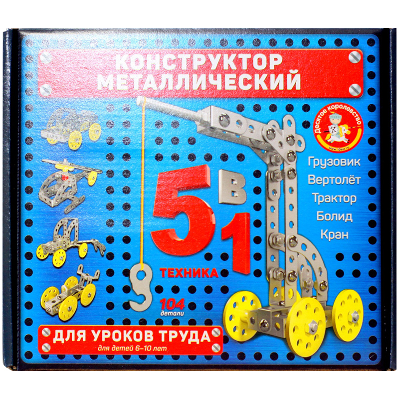 Металлический конструктор Десятое королевство для уроков труда 5 в 1, включает в себя 104 детали, из которых можно собрать 5 моделей: трактор, кран, грузовик, болид, вертолет
