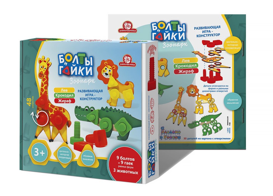 Данная игра направлена на распознавание и соотношение цветов иформ разного размера. Элементы легко соединяются между собой только в правильном сочетании: болт с треугольной шляпкой с треугольной гайкой, квадрат с квадратом ит.д. В карточках предусмотрены отверстия различного размера - под соответствующий вид деталей.