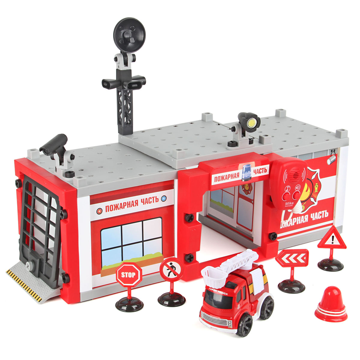 Конструктор блочный 58 деталей + микрофон. Питание: 2*ААА (нет в комплекте). Микрофон с 2 кнопками: кнопка слева - включение сигнала сирена) и мигание лампы на корупсе. Кнопка справа - режим микрофона. Конструктор с отвёрткой. Размер в сборе: 20*50*33 см. Стойки, пол, крыша, ворота - пластиковые детали. Соединение деталей - болтами. Стены - картон с принтом. Стикеры, печать на картоне, упаковка - на русском языке. Машинка инерционная (friction - на разгон). У машинки открывается дверь сзади и поднимаются 2 крышки по бокам. Конструкция набора предусматривает возможность построения зданий большего размера при покупке дополнительных наборов данной серии. Схема сборки конструктора - на упаковке.
