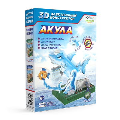 Подарите ребёнку уникальную возможность сделать собственную 3D-модель животного! Собранная из картона фигурка буквально оживёт, как только вы подключите её к электронной цепи. Конструктор «Акула» состоит из картонных деталей, с помощью которых можно соорудить трёхмерную модель, не используя при этом клей и скотч!
