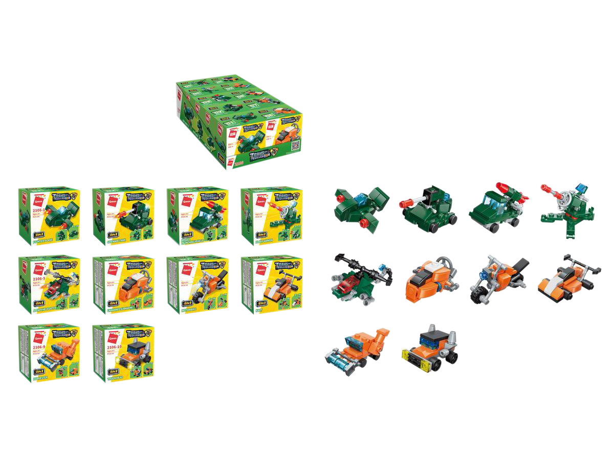 Конструктор " Военная и строительная техника". В ассортименте 10 видов: 2106-1 (истребитель), 2106-2 (танк гранатомет), 2106-3 (ракетная пусковая установка), 2106-4 (зенитная пушка), 2106-5 (ударный вертолет), 2106-6 (беспилотная подводная лодка), 2106-7 (мотоцикл), 2106-8 (карт), 2106-9 (комбайн), 2106-10 (грузовик). Количество элементов: 2106-1 (34 эл.), 2106-2 (35 эл.), 2106-3 (36 эл.), 2106-4 (33 эл.), 2106-5 (30 эл.), 2106-6 (33 эл.), 2106-7 (31 эл.), 2106-8 (32 эл.), 2106-9 (33 эл.), 2106-10 (30 эл.). Поставка в дисплее по 10 штук. Размер дисплея составляет 23*14,5*7,5 см. Размер индивидуальной упаковки составляет 7,0*7*4,5 см. Данный артикул НЕ собирается в один большой конструктор. Из одного маленького конструктора можно собрать 3 вида. В ассортименте 5 видов военной и 5 видов строительной техники.
