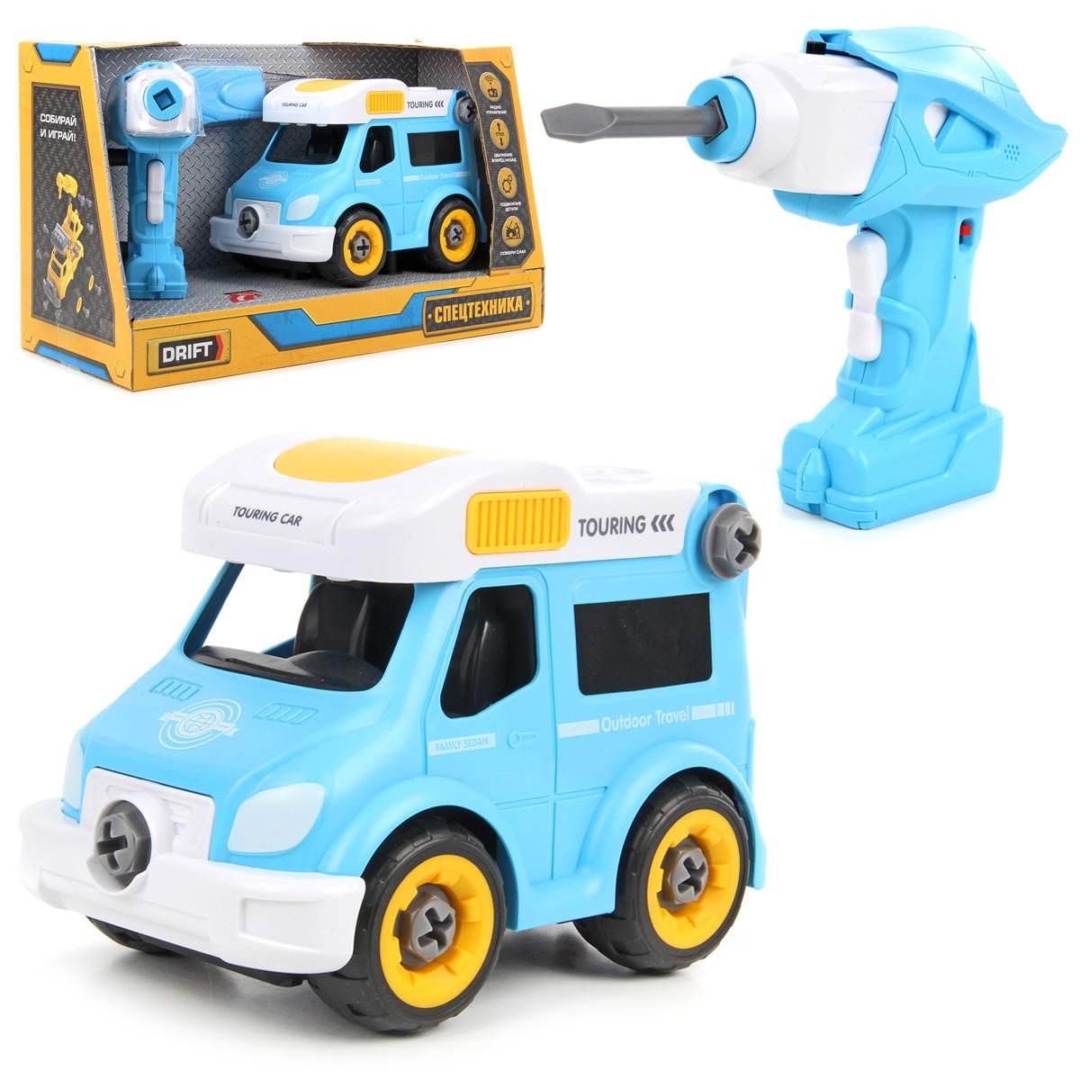 Полезный и занимательный подарок для всех юных любителей конструкторов - разбирающаяся игрушка. Эта яркая машинка привлекает внимание интересным исполнением и функциональностью. В комплект входят машинка, крестовая ручная отвертка, шуруповерт, шлицевая насадка и инструкция по сборке. У шуруповерта вынимается отсек с батарейками в верхней части, если вставить отсек с батарейками в машинку, машинка будет кататься вперед и назад, машинка переднеприводная, шины жесткие. Переключать режимы направления движения можно вручную с помощью рычажка на отсеке с батарейками. Чтобы управлять машинкой дистанционно с помощью шуруповерта вставьте отсек с батарейками в машинку, перейдите в режим R\C, сдвинув рычажок, вставьте батарейки в основание шуруповерта, передвиньте рычажок на ручке шуруповерта в сторону надписи Включено и нажимайте поочередно кнопки на ручке шуруповерта, машинка будет кататься вперед или назад. Если вставить отсек с батарейками в верхнюю часть шуруповерта, можно выбрать режим откручивания или закручивания винтов. В основании шуруповерта находится отсек для батареек. Если вставить отсек с батарейками в верхнюю часть шуруповерта и батарейки в основание инструмента, перевести рычажок на корпусе инструмента во включенное состояние, то, нажимая на кнопки на корпусе инструмента, можно выбрать режим откручивания или закручивания винтов. Работа шуруповерта, когда вставлены батарейки только в верхнюю часть инструмента, не зависит от передвижения рычажка в сторону режима Включено (инструмент будет работать вне зависимости от выбранного на корпусе шуруповерта режима). У ручной отвертки есть отделение в задней части, куда вставляется шлицевая насадка, ее можно вставить в патрон шуруповерта. Разные элементы машинки крепятся на винтах, которые можно открутить с помощью ручной отвертки или шуруповерта. Снимаются крыша, задняя дверца, бампер, корпус машинки, элемент с сиденьями и колеса. Крыша разбирается на детали. В собранном виде у машинки поднимаются и опускаются задняя дверца и крыша. Если нажать на кнопку под бампером автомобиля, машинка издаст звук. Машинку можно катать вручную, можно вставить в нее батарейки. Игрушка отлично развивает мелкую моторику рук, координацию движений, логическое и пространственное мышление, навыки моделирования, воображение. Шуруповерт и машинка работают от 2 батареек АА, не входят в комплект. В основание шуруповерта нужно вставить 2 батарейки АА, не входят в комплект. Машинка работает от 3 батареек AG13 (при подаче звуковых сигналов), входят в комплект. Игрушка изготовлена из высококачественного и безопасного полимерного материала. Размеры машинки: 19*11*13,5 см. Размеры шуруповерта с батарейками и насадкой: 18,5*6*14,5 см. Размеры ручной отвертки: 14*4*2 см. Размеры коробки: 33*13*20 см.