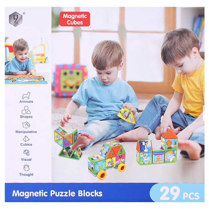 Конструктор содержит 2 платформы с колесами +9 треугольных (6,2см) +18 квадратных (6,5см) магнитных деталей , из которых можно сложить пазл, сделать различные фигурки, машинку. Размер упаковки 28,5*6*28 см.