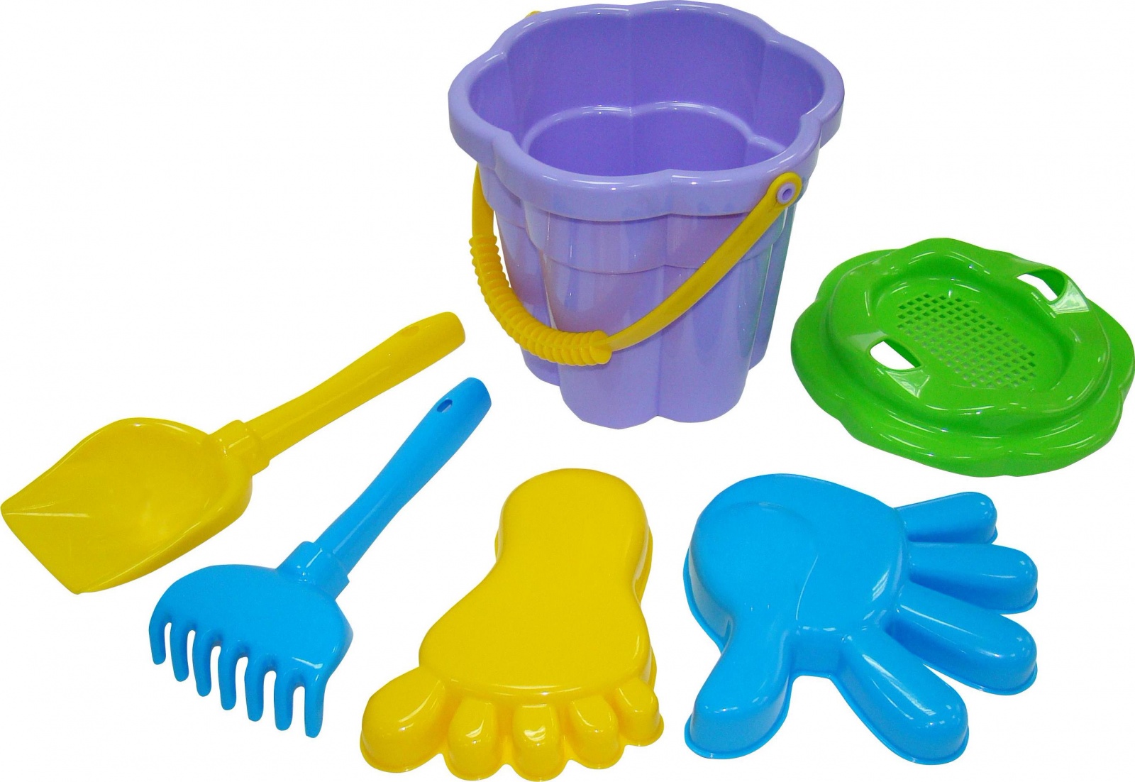 Набор №308: ведро-цветок среднее №3, ситечко-цвеок среднее №3, лопатка №5, грабельки №5, формочки
