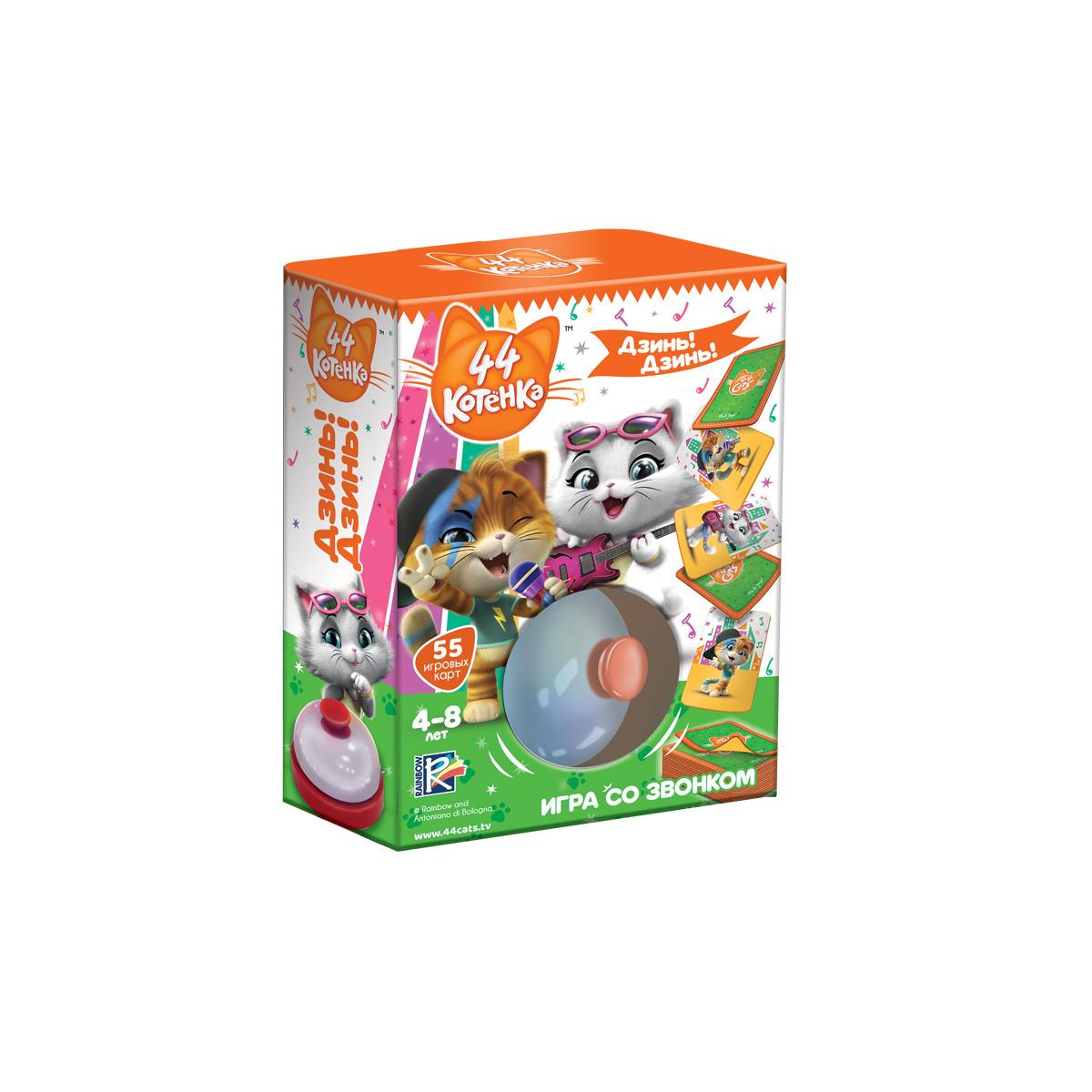 "В игре принимают участие от 2 до 4 игроков. Раздаем поровну карты, переворачиваем их по одной и ищем совпадения. На всех картах изображены герои мультсериала «44 Котенка». Но на некоторых из них наши герои держат какой-то предмет в руках, а на некоторых – нет. Будьте внимательны, ведь перепутать карточки очень легко! Уверены, что нашли две одинаковые? Тогда скорее жмите на звонок!"