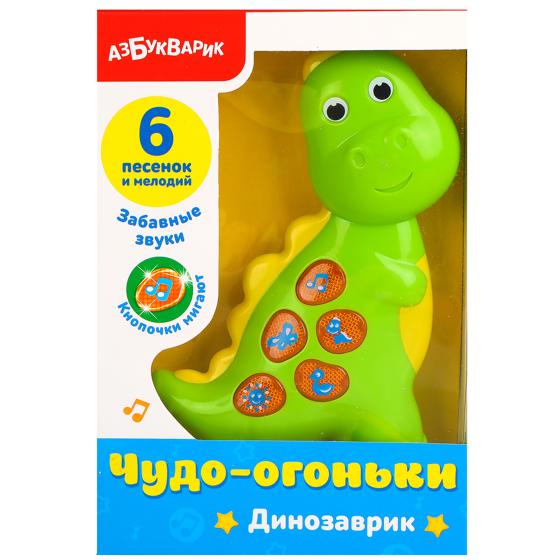 Подружись с ярким динозавриком! Слушай песенки ("Если нравится тебе, то делай так", "Какой чудесный день", "Два весёлых гуся"), мелодии и забавные звуки. А мигающие огоньки сделают игру ещё интереснее! Бонус - QR-код для скачивания 15 интерактивных потешек для смартфона или планшета в приложении «Азбукварик».