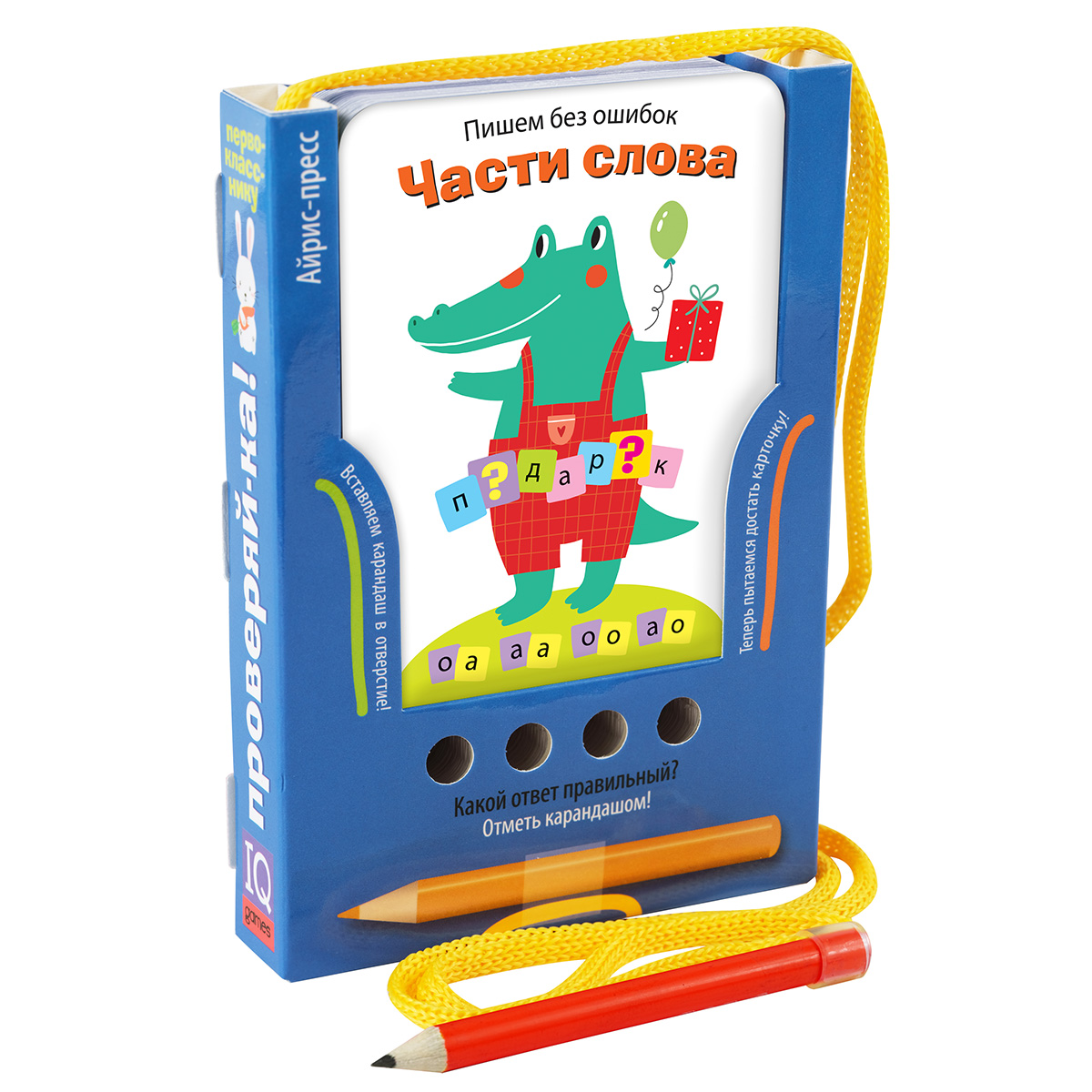 Этот комплект карточек поможет ребёнку научиться правильно определять части слова и без ошибок писать наиболее трудные морфемы в начальной школе. Обучение по этим карточкам нравится детям, они с удовольствием работают с ними самостоятельно. + 2 разных игры и 96 заданий. + 48 двухсторонних карточек. + Удобная система самопроверки. Первая игра с карточками построена по типу теста. Ребёнок выбирает пропущенные буквы, подбирает слово к схеме, ищет корень, суффикс, приставку и т. д. Выбрав подходящий вариант ответа, надо вставить карандаш в отверстие под ним. Если ответ правильный, то карточка легко вынимается из блока. Если ребёнок выбрал неверный вариант ответа, он не сможет вытянуть карточку и перейти к следующему заданию. Во второй игре нужно выполнять задания карандашом, подбирать приставки и суффиксы, составлять слова, вставлять буквы и вычеркивать лишние. Выполнив задание, можно вытянуть карточку из блока и проверить себя, сверяя свой ответ с правильным.
