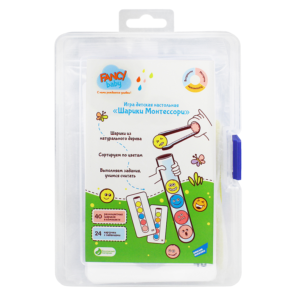 Сортер по методу Монтессори. В составе: 24 карточки с заданиями, 40 деревянных шариков разных цветов, 1 пробирка и 1 пинцет из пластика. Ребенок может сортировать шарики по цветам, собирать их в пробирку, тренируя координацию и внимательность. Также, это отличный счетный материал. Как играть? Изучите с ребенком шарики, каких они цветов, посчитайте их. Пусть малыш повторит названия. На карточках нарисованы схемы, по которым нужно собрать шарики в пробирку в определенном порядке. Например: 2 красных, 2 зеленых, 2 желтых. Начните собирать с первых карточек, по увеличению нумерации карточки схемы меняются и усложняются. Сначала можно собирать шарики ручками, а когда пальчиковый захват будет хорошо натренирован, можно попробовать заниматься с пинцетом. Диаметр шарика составляет 1,5 см; пробирка: 15,3*2 см; пинцет: 10 см.