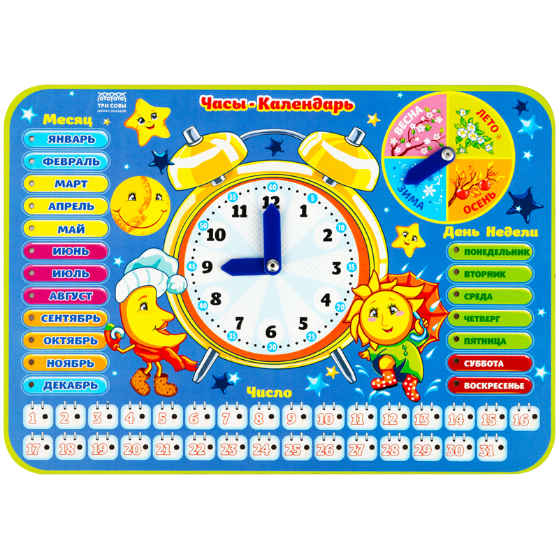Развивающая игрушка представляет собой красочный деревянный планшет с подвижными стрелками и съёмными пластиковыми деталями-указателями. Игрушка обучает ребенка ориентироваться во времени, погоде и явлениях природы, помогает изучить дни недели, месяцы, времена года.