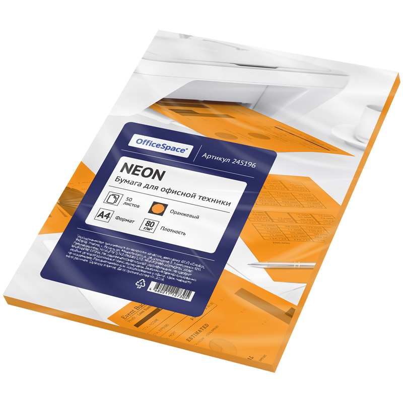 Цветная бумага формата А4, плотность 80 г/м2, цвет neon оранжевый, 50 листов, упаковка - пакет с клеевой полосой.