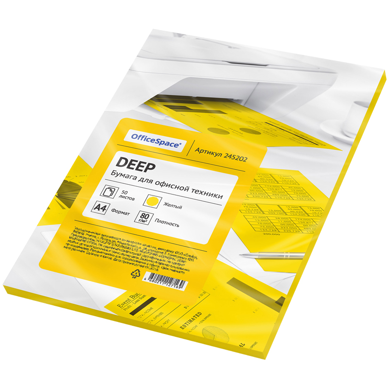 Цветная бумага формата А4, плотность 80 г/м2, цвет deep желтый, 50 листов, упаковка - пакет с клеевой полосой.
