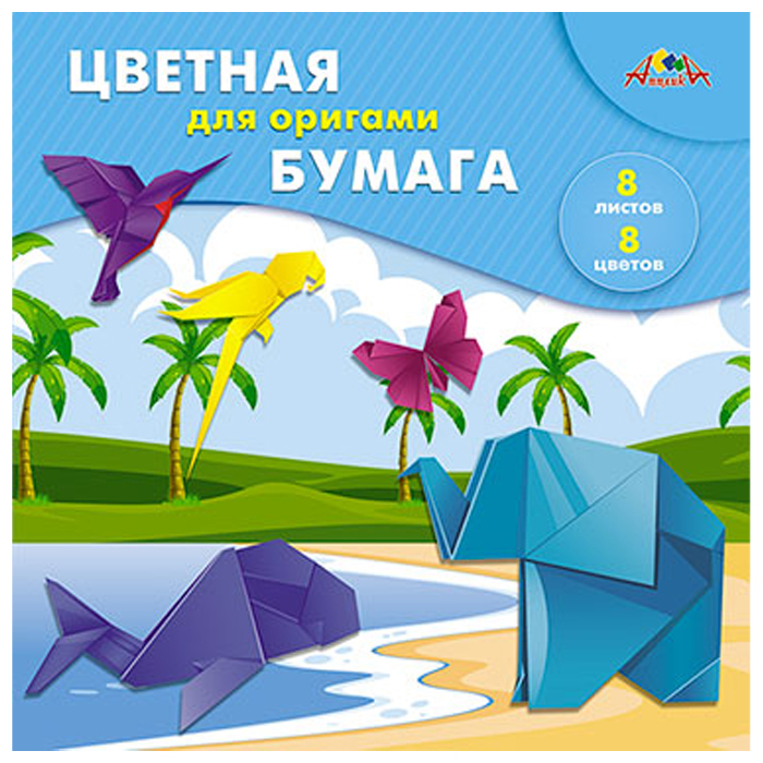 Цветная бумага для оригами, 20х20 см., 8 л., 8 цв., в папке, "Тропики"