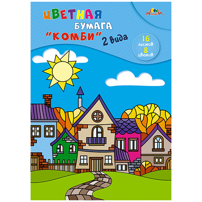 Цветная бумага КОМБИ 2 вида , А4, 16 л., 8 цв., "Цветные дома"