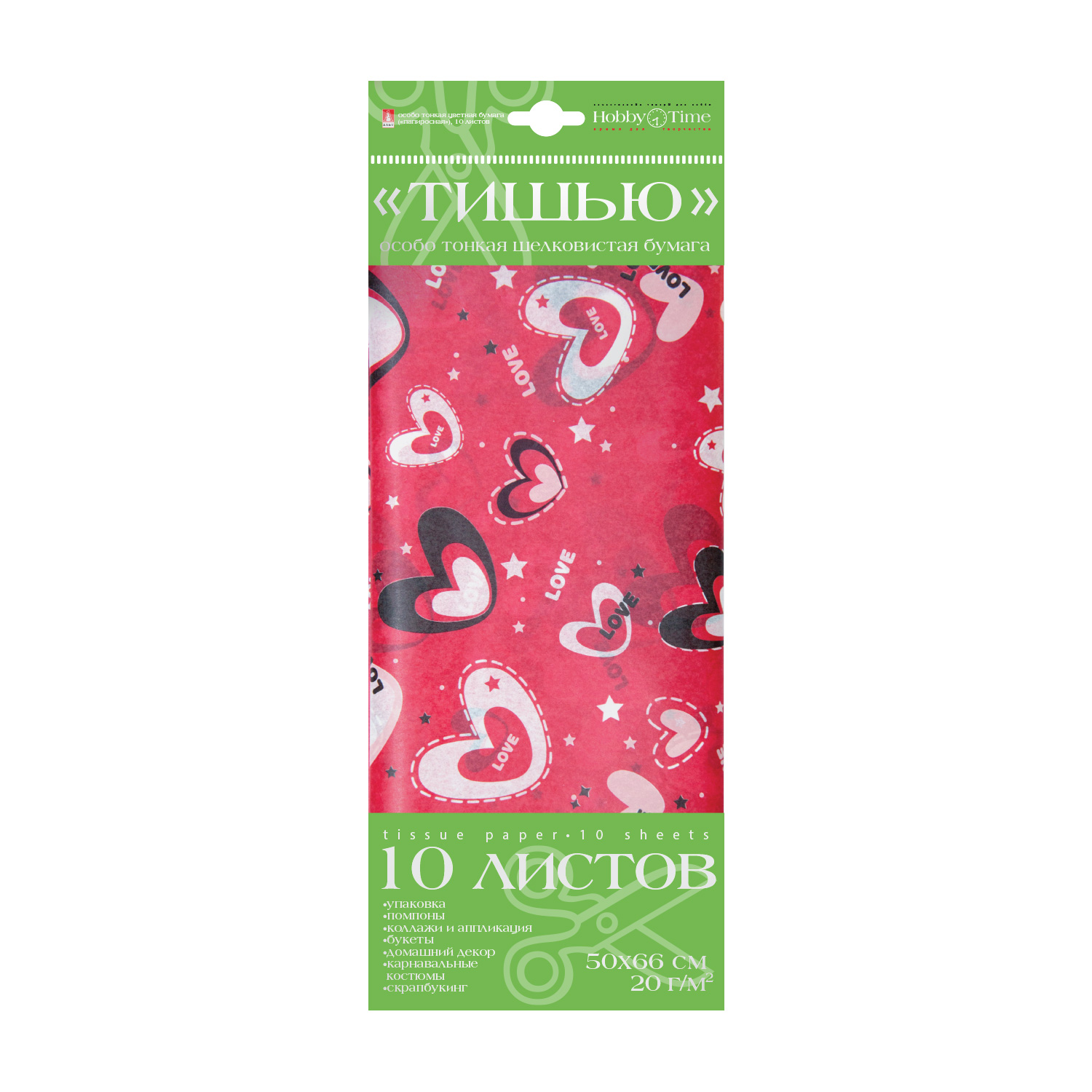 БУМАГА С ОРНАМЕНТОМ "ТИШЬЮ", 10 ЛИСТОВ, "СЕРДЕЧКИ. КРАСНЫЕ"