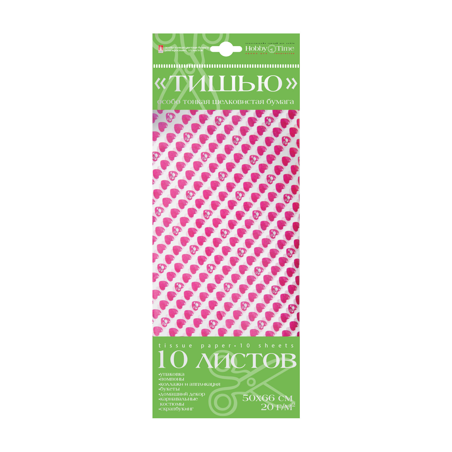 БУМАГА С ОРНАМЕНТОМ "ТИШЬЮ", 10 ЛИСТОВ, "СЕРДЕЧКИ. ФУКСИЯ"