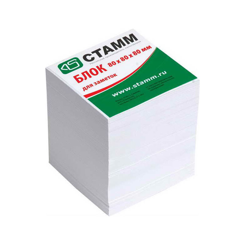 Блок для записи 8х8х8см, непроклеенный. Бумага белая, плотностью 80гр/м.кв. Упакован в термоусадочную пленку с цветным вкладышем.