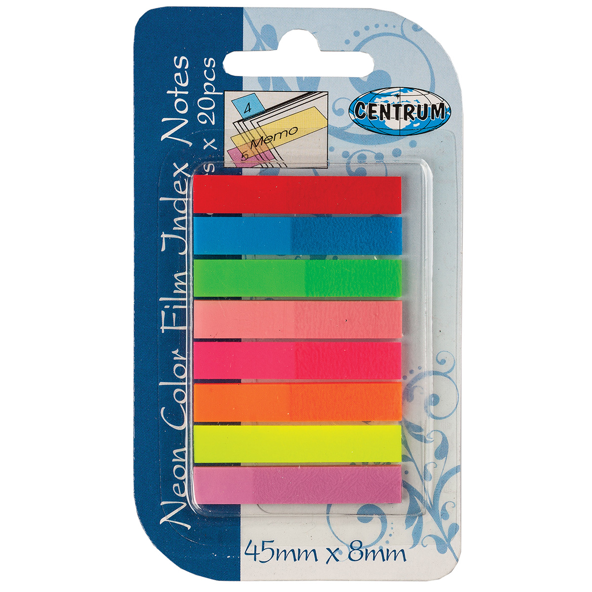 83504 Клейкие листки-индексы пластиковые 8 цветов по 20 листов, 45х8 мм. Клейкие листки - индексы Centrum позволят быстро выделить нужную информацию на любом бумажном носителе или использовать их в качестве пометок и указателей. Могут использоваться для нанесения надписей. Индексы представляют собой пластиковые листки небольшого размера с клеевым краем. Предназначенные для маркировки любой поверхности, они не оставляют следов клея после удаления, а также подходят для многократного переклеивания. В наборе 8 разноцветных блоков по 20 листов. Размер блока: 45*8 мм.