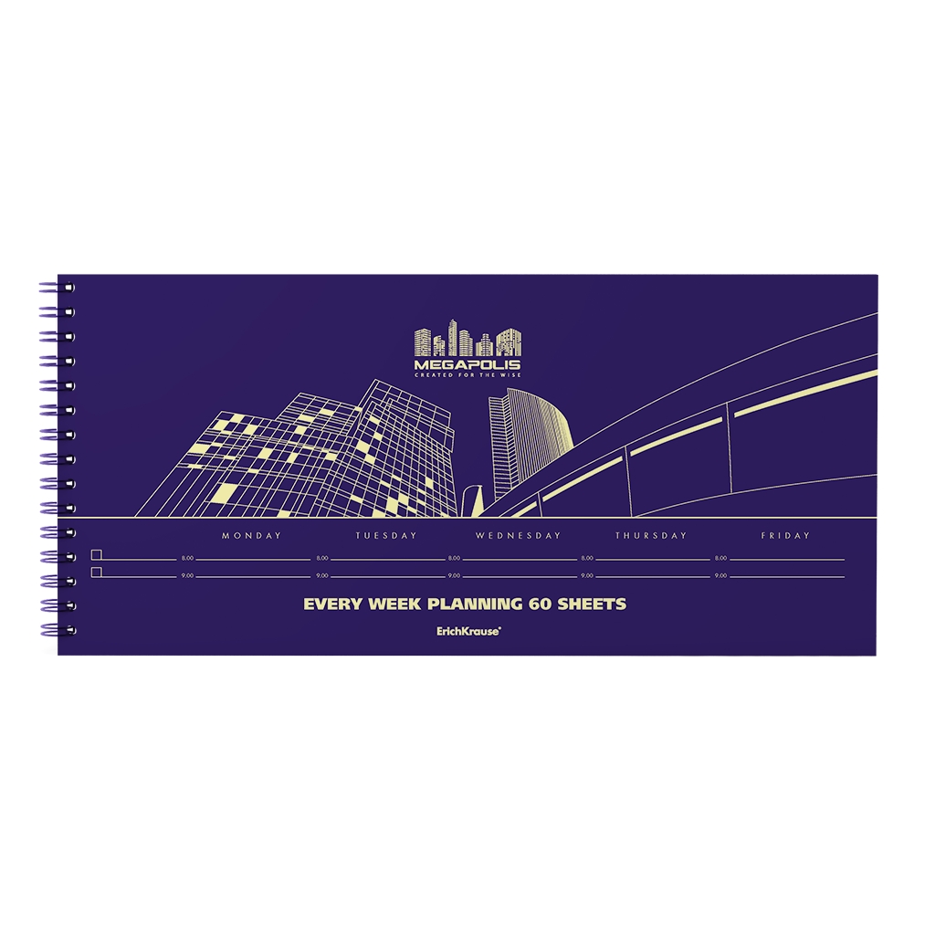 Планинг Every week настольный на спирали ErichKrause® MEGAPOLIS®. Включает 60 листов из тонированной желтой бумаги плотностью 65 г/кв.м. Верхняя обложка синего цвета выполнена из плотного картона 170 г/кв.м, подложка — картон толщиной 2 мм. Листы скреплены двойной евро-спиралью (спираль слева), что позволит сохранять записи предыдущих дней. На одном развороте помещаются записи на одну неделю. Планинг позволит систематизировать ежедневные дела, как по степени важности, так и по времени выполнения. Формат: 135х290 мм.
