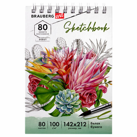 Скетчбук белая бумага 100 г/м2 142х212 мм, 80 л., гребень, твердая обложка, BRAUBERG ART DEBUT, 112984