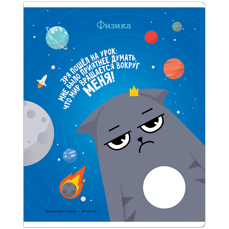Тетрадь тематическая «Физика» из серии «Котоцинизм» (в серии 15 предметов), со справочным материалом на отдельных листах. Формат А5 (165*205 мм). Вид крепления – скрепка. Внутренний блок – 48 листов, офсет 65 г/м?, белизна 100%, линовка – клетка с полями. Обложка – целлюлозный картон, отделка обложки – ТВИН-лак.