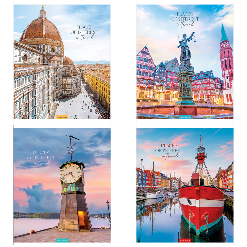 ВНИМАНИЕ: БОЛЬШИНСТВО ЭЛЕМЕНТОВ В НАБОРЕ МОГУТ ИМЕТЬ ОДИНАКОВЫЙ ДИЗАЙН. Общая тетрадь "Путешествие. Places of interest" формата А5 (165*205мм) на скрепке состоит из 48 листов. Внутренний блок – это офсетная бумага плотностью 60-65 г/м, белизна 100%, линовка – клетка с полями. • Количество листов: 48; • Формат тетради: А5 (165*205мм); • Линовка: клетка с полями; • Белизна: 100%; • Крепление: скоба; • Материал обложки: мелованный картон.