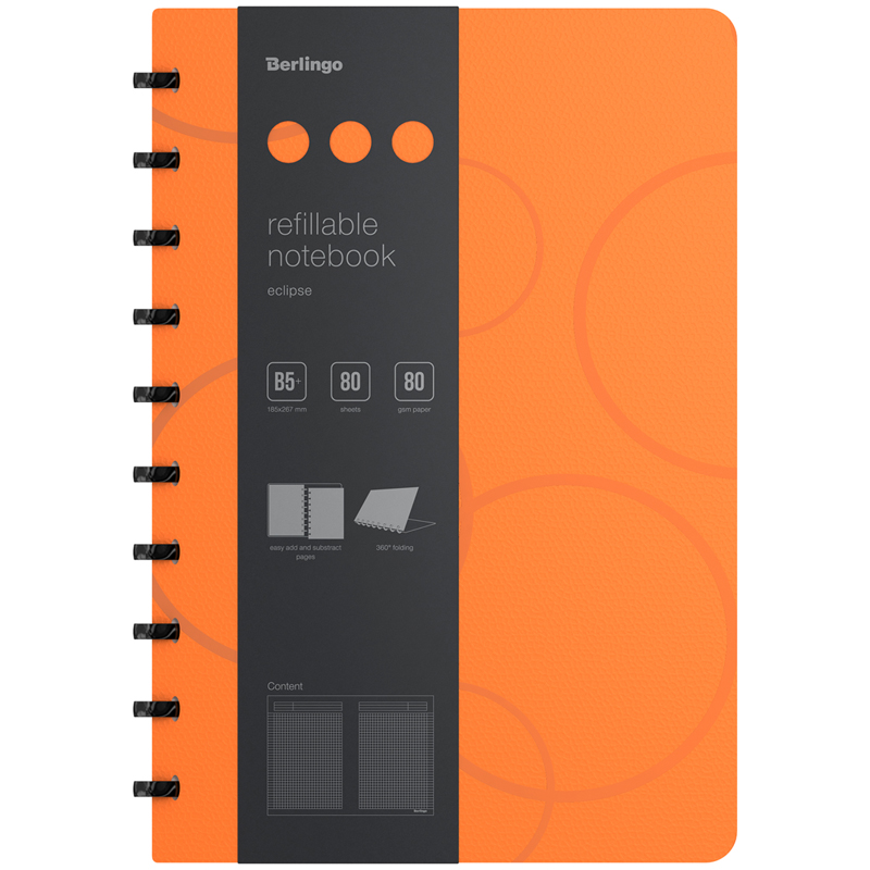 Бизнес-тетрадь B5+, 80л., Berlingo "Eclipse", клетка, на кольцах, с возм. замены блока, 80г/м2, пластик (полифом) обложка, линейка-закладка, оранжевая