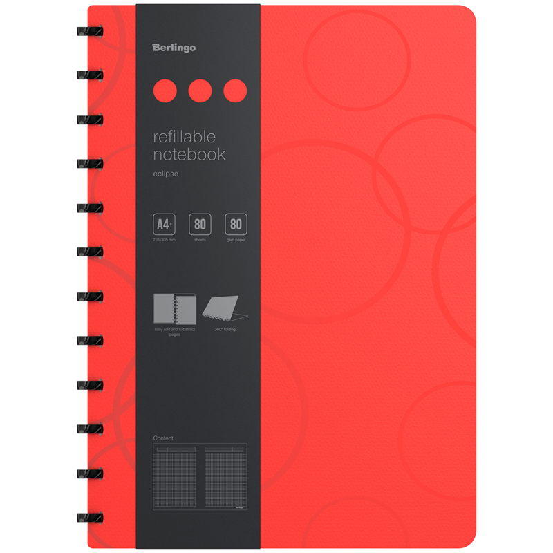 Бизнес-тетрадь А4+, 80л., Berlingo "Eclipse", клетка, на кольцах, с возм. замены блока, 80г/м2, пластик (полифом) обложка, линейка-закладка, красная