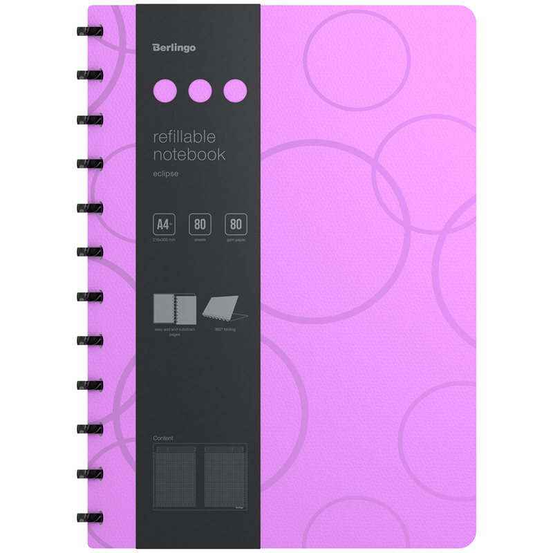 Бизнес-тетрадь А4+, 80л., Berlingo "Eclipse", клетка, на кольцах, с возм. замены блока, 80г/м2, пластик (полифом) обложка, линейка-закладка, фиолетов