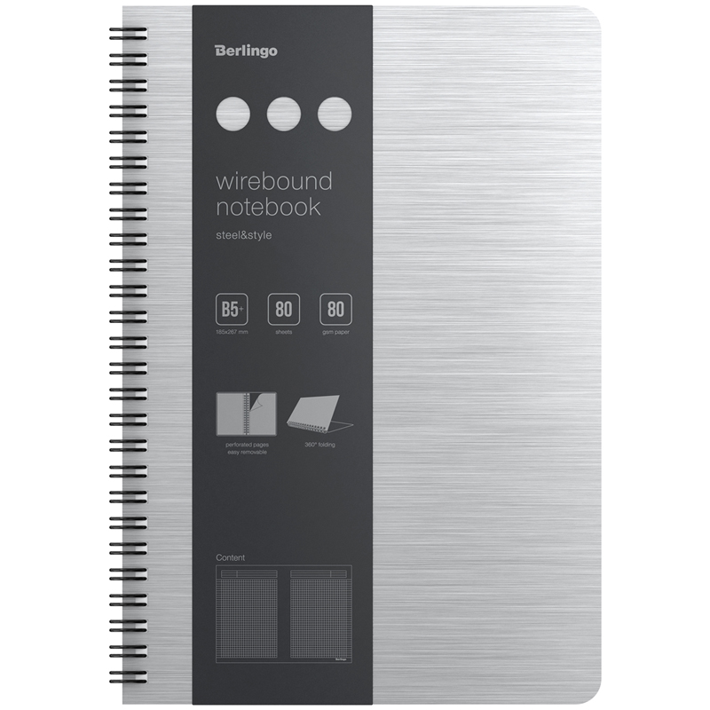 Бизнес-тетрадь B5+, 80л., Berlingo "Steel&Style", клетка, на гребне, 80г/м2, пластик (полифом) обложка, линейка-закладка, серебристый металлик
