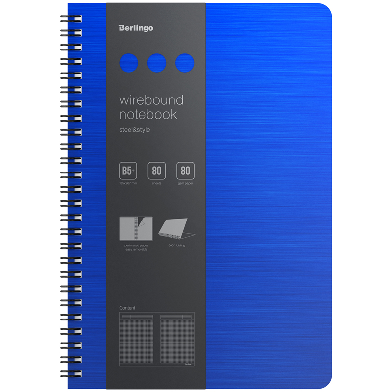 Бизнес-тетрадь B5+, 80л., Berlingo "Steel&Style", клетка, на гребне, 80г/м2, пластик (полифом) обложка, линейка-закладка, синяя